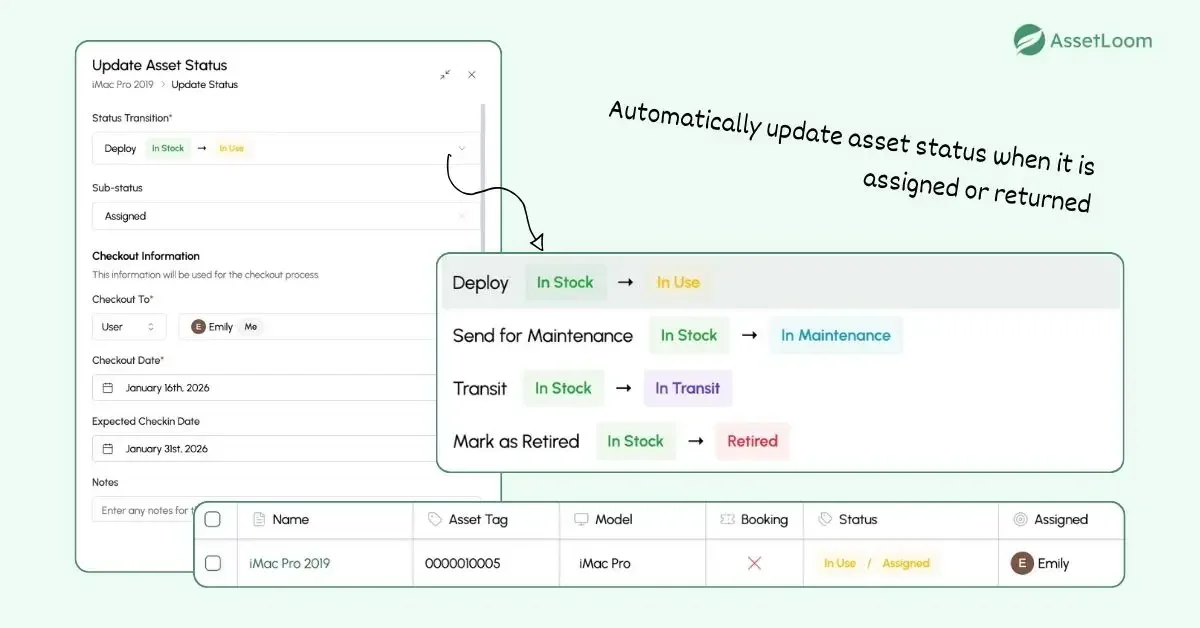 Automatically update asset status when it is assigned or returned in AssetLoom
