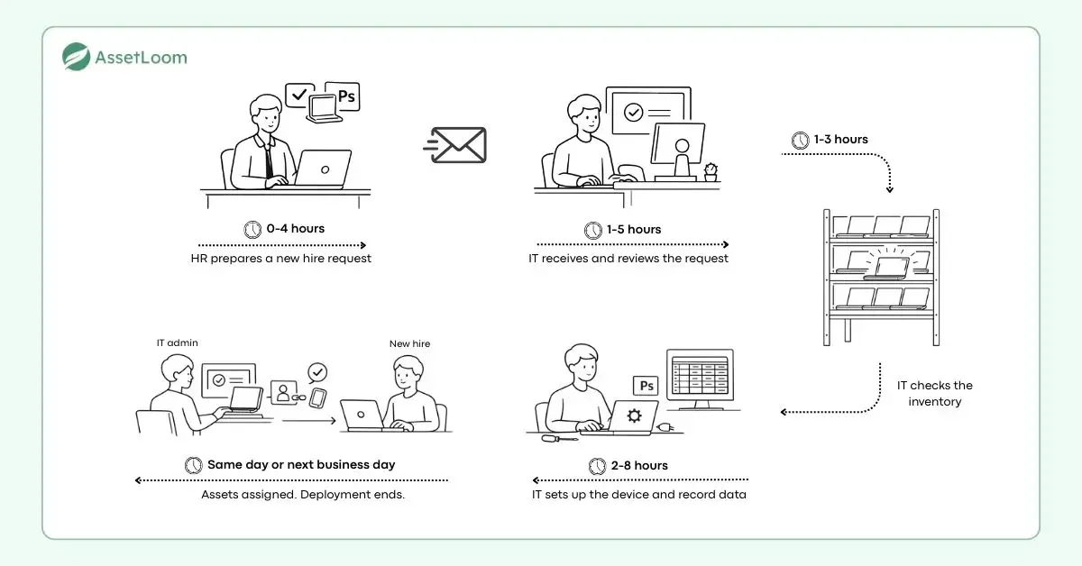 If the request includes all necessary information (e.g., start date, required equipment, and software needed to be installed for that newcomer), IT can act immediately. If details are missing, this step may take a full day of back-and-forth emails.