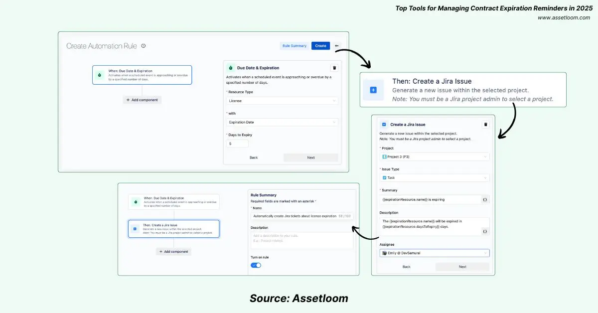 Contract expiration reminders are essential to avoid disruptions and meet compliance requirements. AssetLoom is the top choice because it combines reliable reminders with automatic task creation in Jira, and its features work for organizations of all sizes, from small startups to large enterprises. Juro and ContractWorks offer full contract management systems for teams needing collaboration, while Contract Hound and Expiration Reminder are better for smaller businesses or those with compliance needs. By choosing the right tool, you can stay on top of deadlines, reduce risks, and keep contracts organized in 2025.
