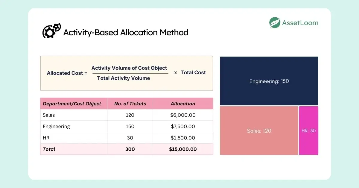 A company spends $15,000 per month on IT support. Sales generated 120 support tickets, Engineering 150, and HR 30, for a total of 300 tickets.
