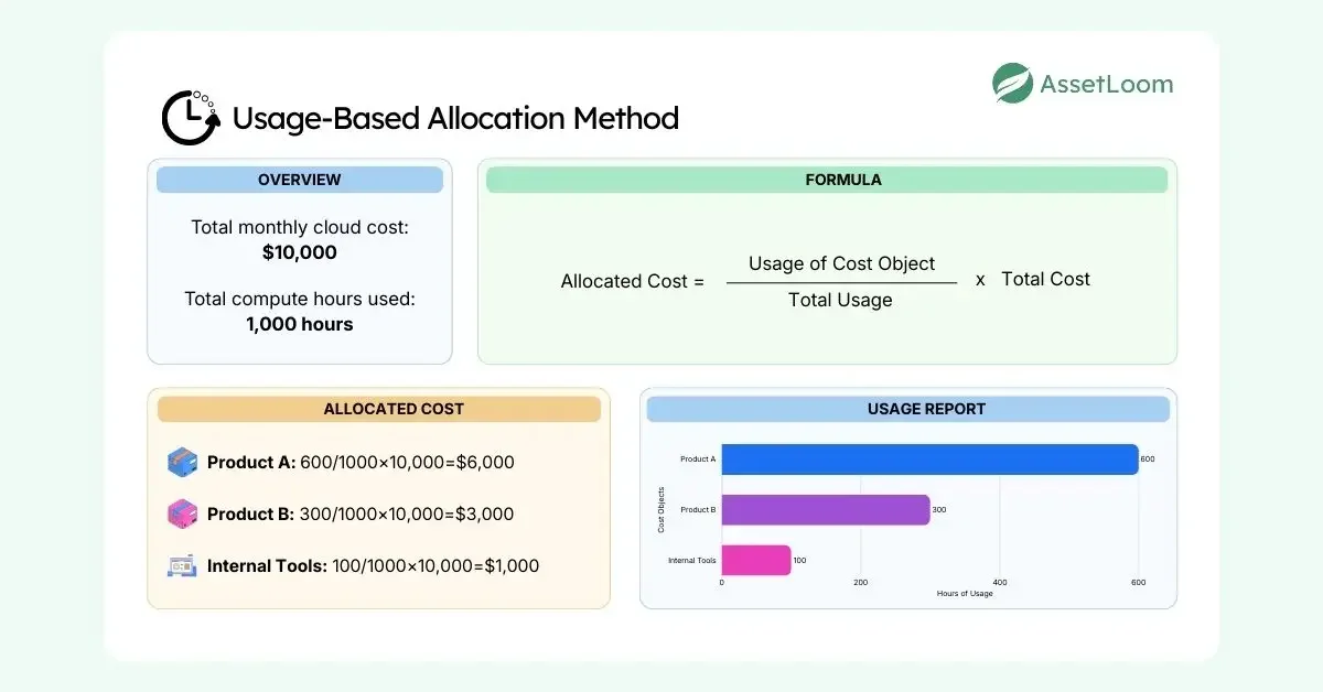 Usage-based method works best for costs that scale directly with activity or consumption, such as cloud services, usage-based software, utilities, or transaction-driven platforms.