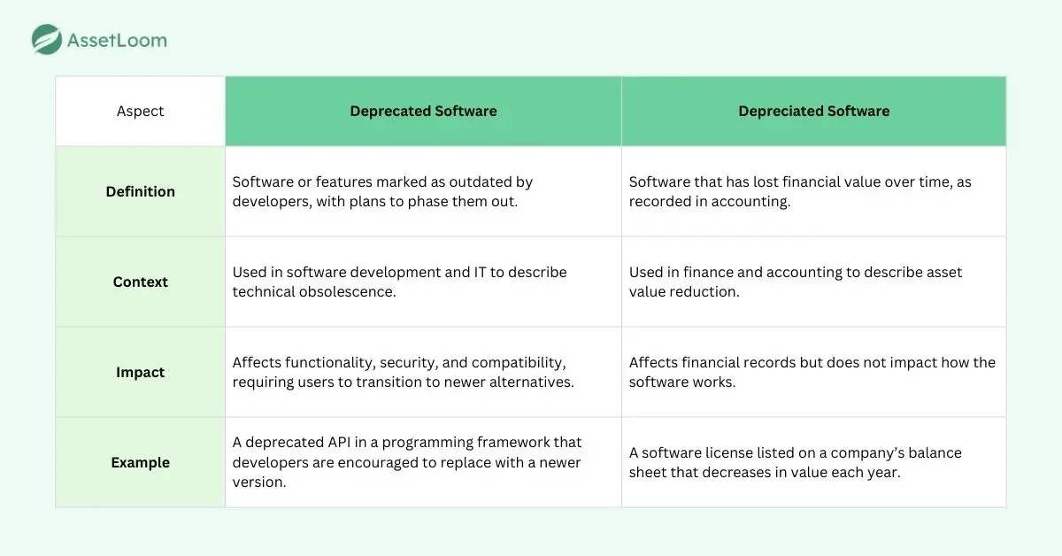 - Depreciated Software: Affects financial records but does not impact how the software works.