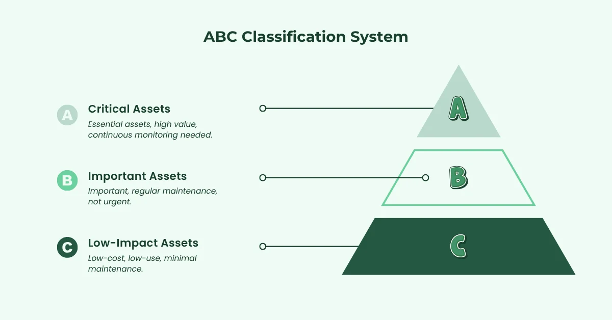 - Use an ABC classification system: A for critical assets, B for important assets, C for low-impact assets.
