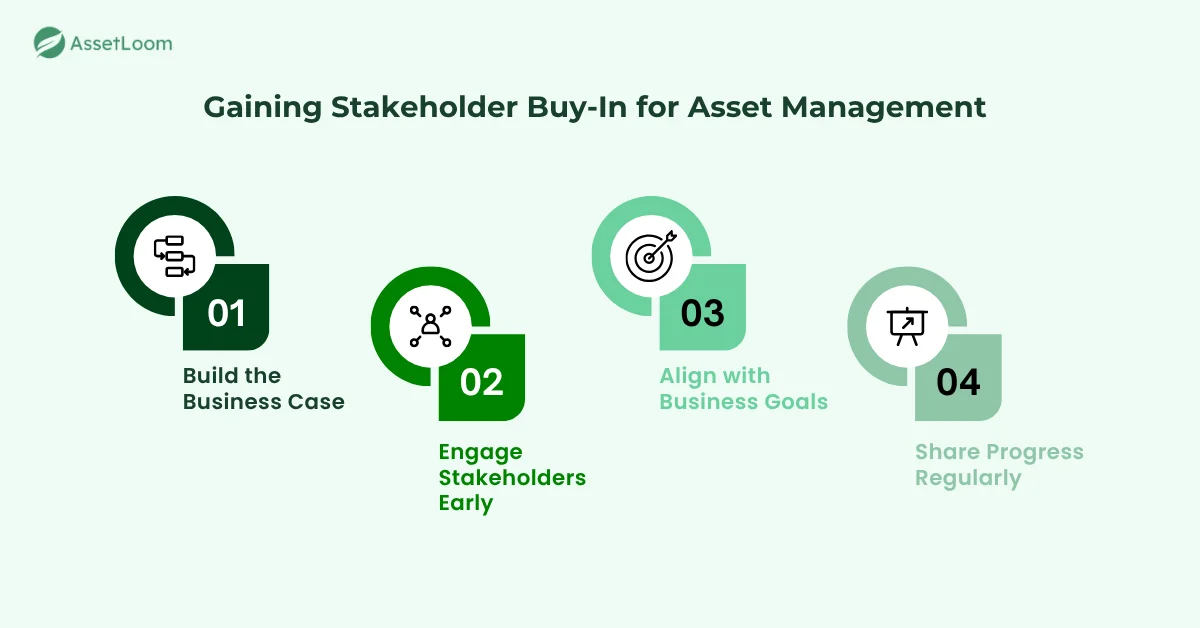 Start by clearly communicating the value of a streamlined asset management system. Focus on the benefits: cost savings, improved efficiency, and risk reduction. Use data from initial audits or asset performance reviews to highlight areas for improvement and the potential savings these changes can bring.