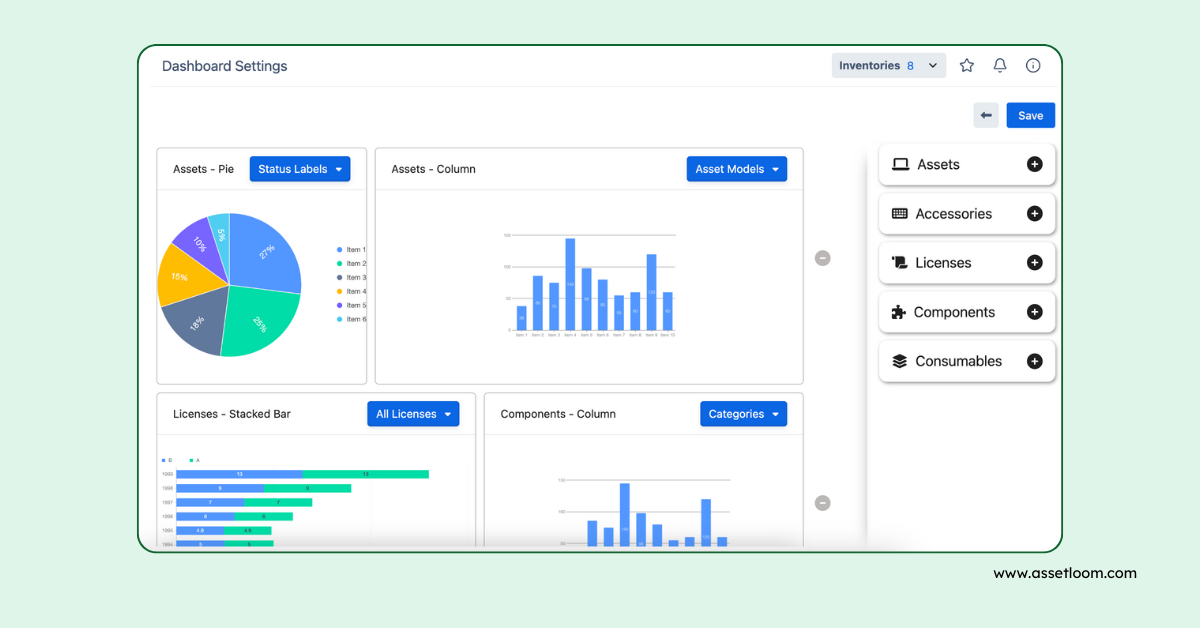 AssetLoom offers a powerful and customizable dashboard that helps you manage inventory with ease. Here are some key features:
